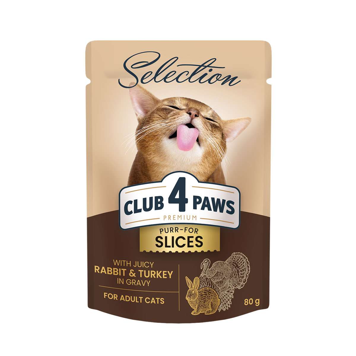 Вологий корм для котів CLUB 4 PAWS Преміум Плюс Селекшн, шматочки з кроликом та індичкою в соусі, 80г