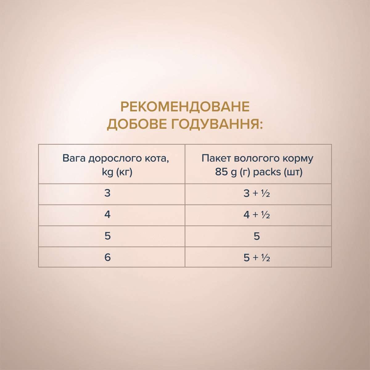 Енергетична цінність (калорійність) 100 g (г) корму: 303,26 kJ (кДж) (72,48 kcal (ккал)). Термін придатності: 24 місяці з дати виробництва. Зберігати в сухому місці за температури від +6 ºС до +30 ºС. Корм у відкритому пакованні зберігати в холодильнику не довше, ніж 48 год. Порція корму повинна бути кімнатної температури. Корм необхідно вводити в раціон поступово (принаймні протягом перших 5-ти d (днів)). Забезпечити тварині постійний доступ до чистої свіжої питної води. Індивідуальні норми годування можуть змінюватися, залежно від віку, породи, рівня активності та середовища перебування тварини.