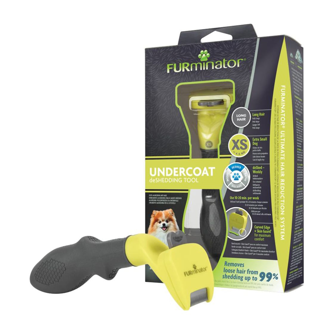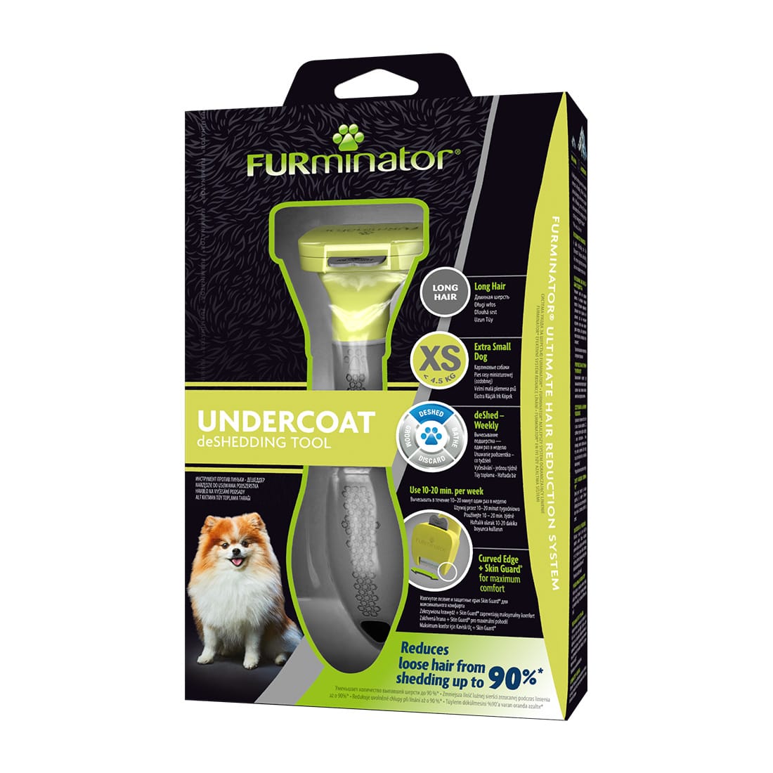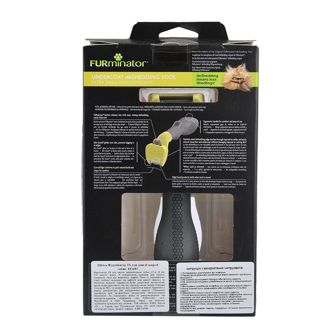 Інструмент FURminator XS для мініатюрних собак (до 4,5 кг) із довгою шерстю зменшує линяння на 90%. Призначений для шерсті довше 5 см. Використовуйте на сухій шерсті 1-2 рази на тиждень протягом 10-20 хвилин.