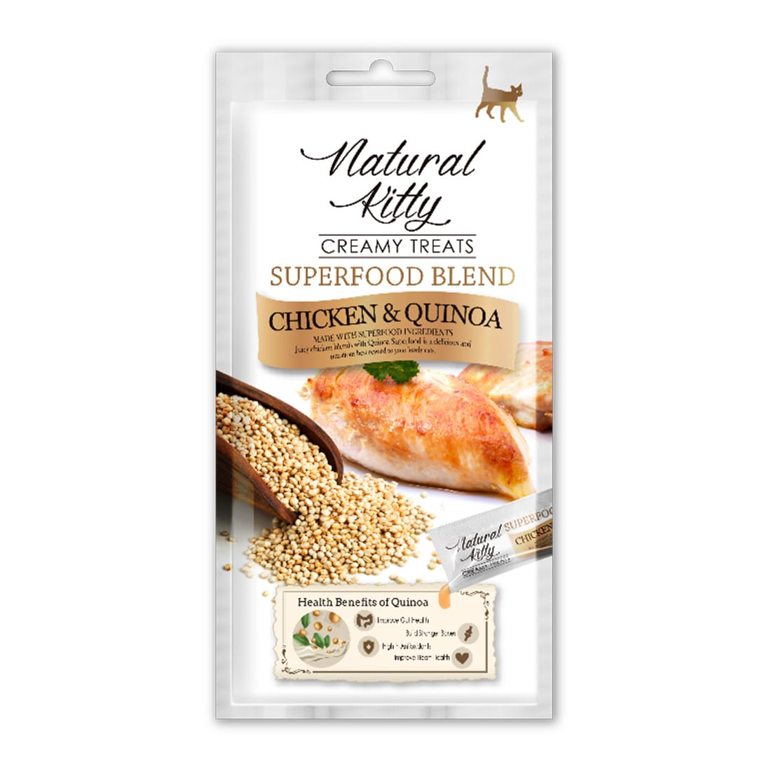 Natural Kitty Creamy Treats Chicken with Quinoa Крем-снек виготовлено зі 100% справжньої курки, з додаванням кіноа для покращення поживності та смаку. Це найкраща щоденна нагорода для ваших котів. Додатковий корм для котів.
