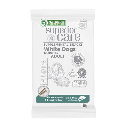 Беззернові ласощі з лососем для дорослих собак всіх порід з білим окрасом шерсті Nature’s Protection Superior Care White Dogs Hypoallergenic & Digestive Care